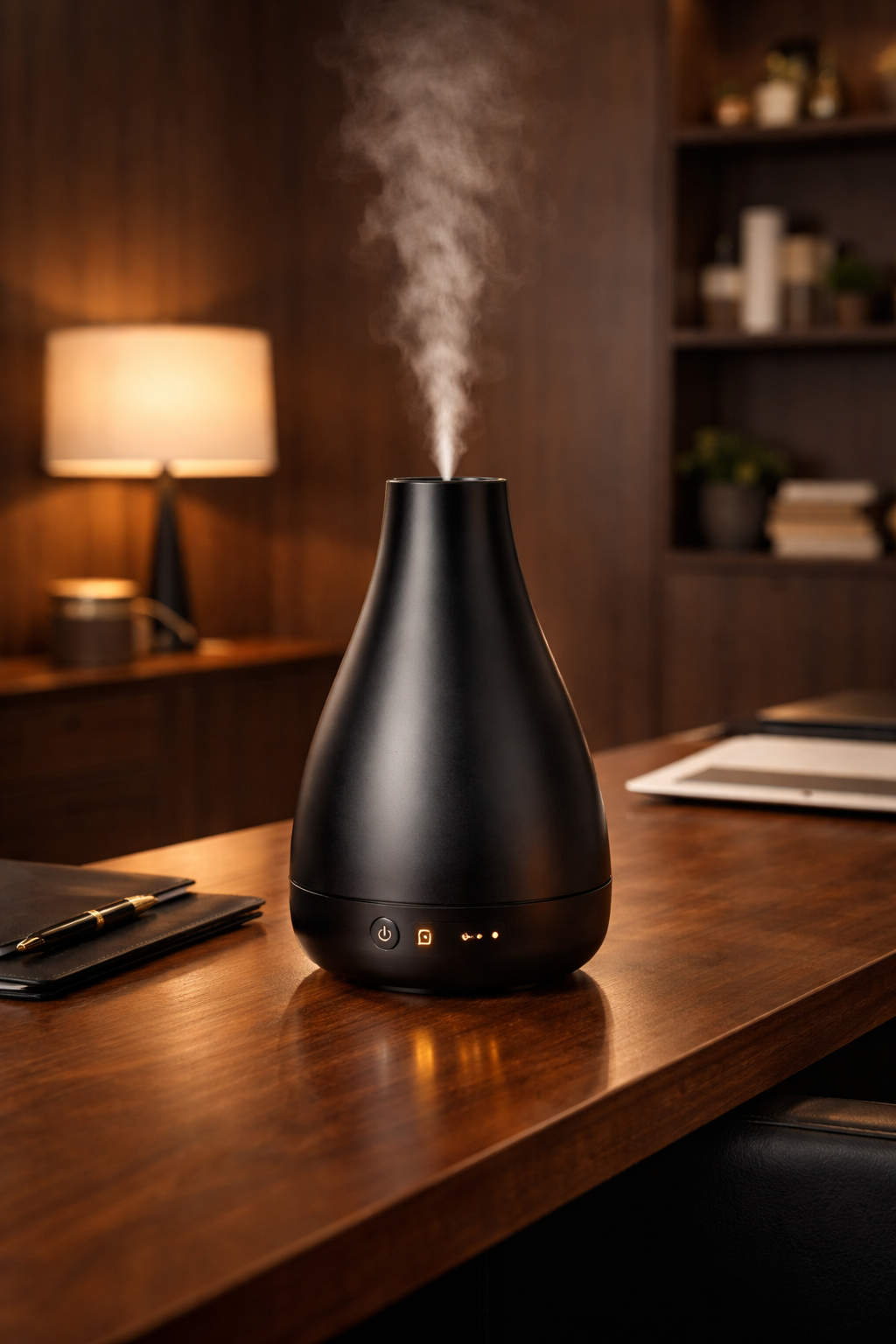 Metal Body A tall, elegant floor-standing metal diffuser with a 1200ml capacity and intelligent PCB control. Available in black or white, it blends seamlessly into office lobbies, showrooms, and hotel corridors requiring serious coverage.