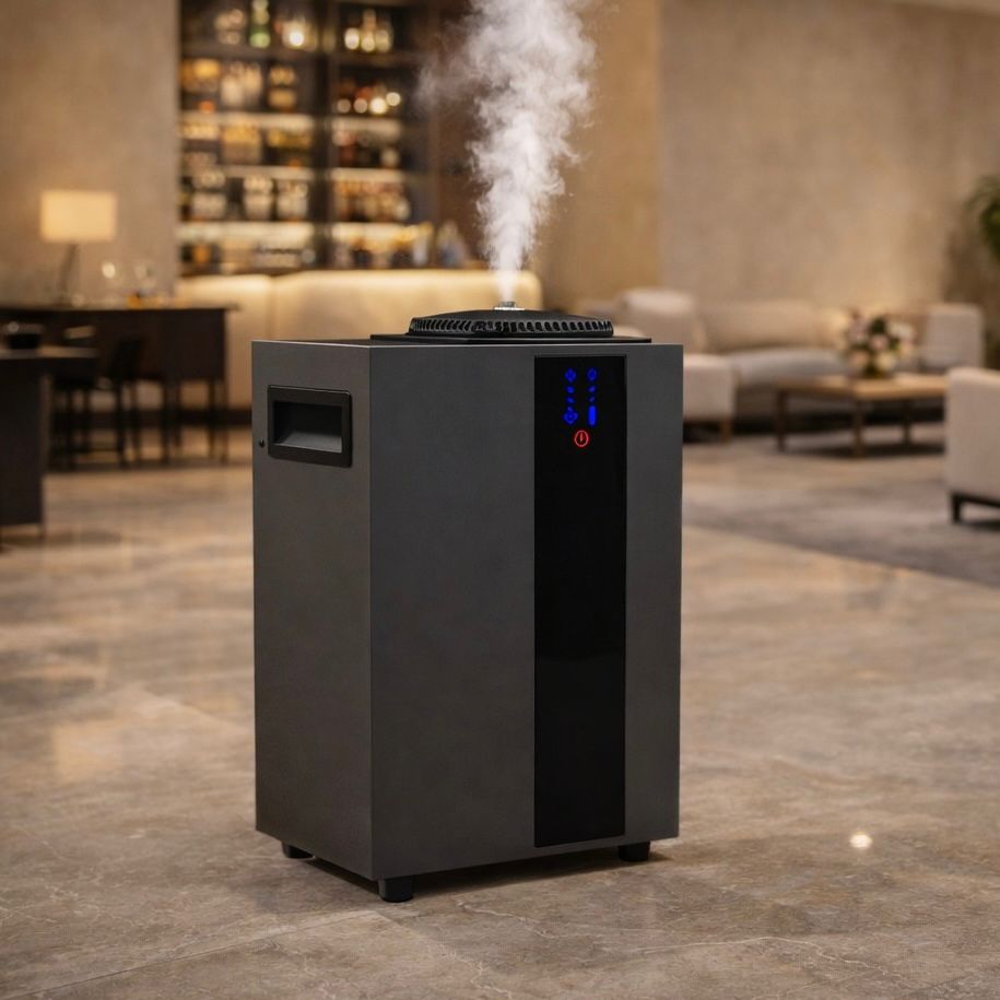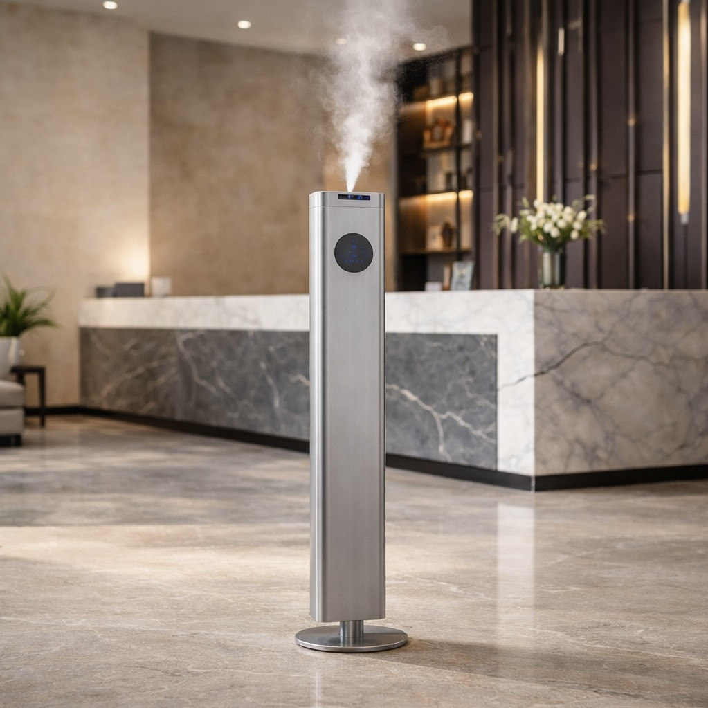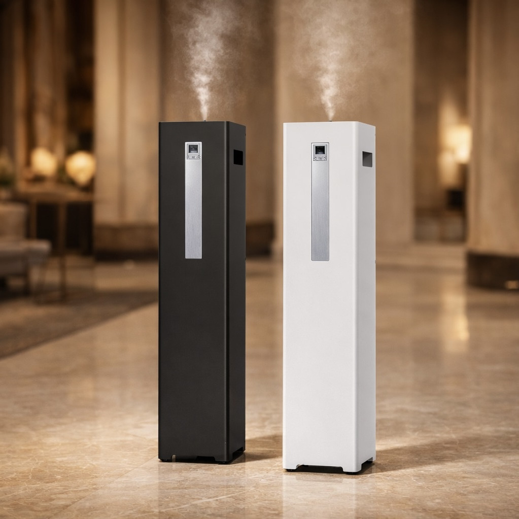 A dramatic freestanding tower diffuser that makes a statement in any grand space. With 2000 CBM coverage, remote control operation, and whisper-quiet performance, it’s the top choice for hotels, malls, and large venues.
