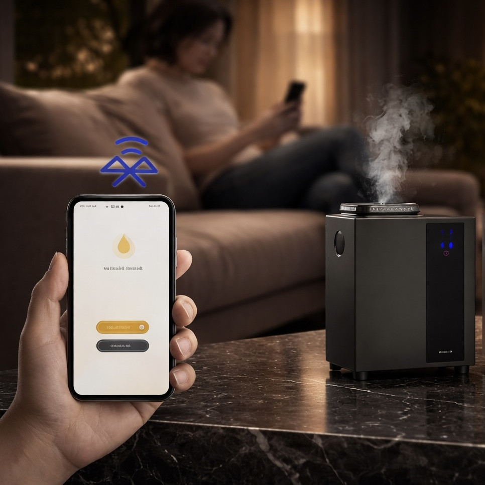 Control your fragrance from anywhere with the BKApp Bluetooth diffuser. Covers 1,500–4,000m² with two-fluid atomization technology, 800ml oil capacity, and whisper-quiet 35dB operation. Perfect for restaurants, lounges, and retail spaces.