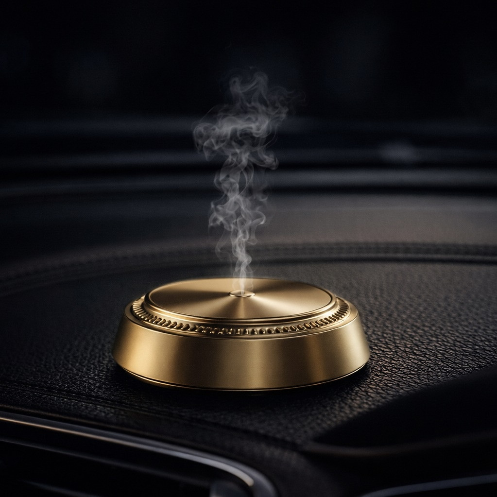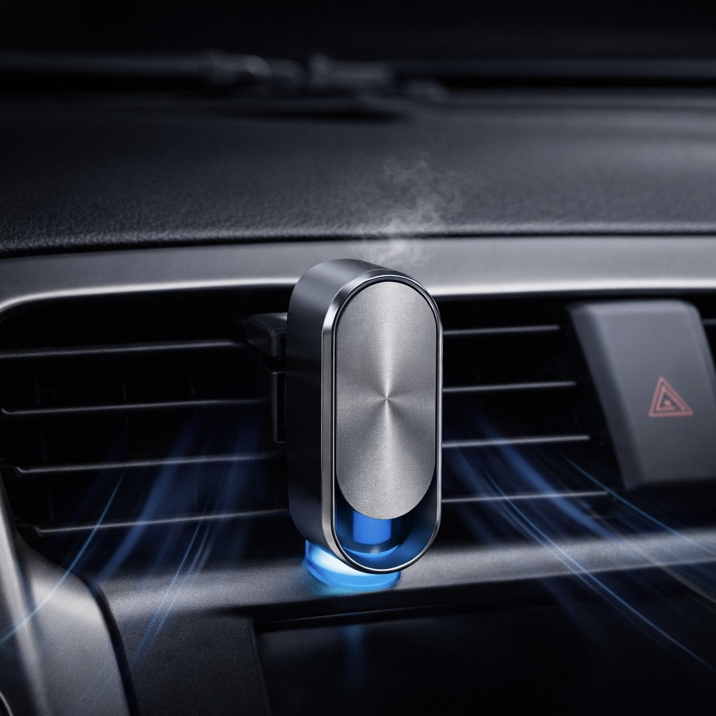 A premium PC and aluminium ultrasonic vent clip diffuser with a glass oil bottle. Simply clips onto your car vent for instant, residue-free freshness. Small, stylish, and long-lasting — luxury for every drive.